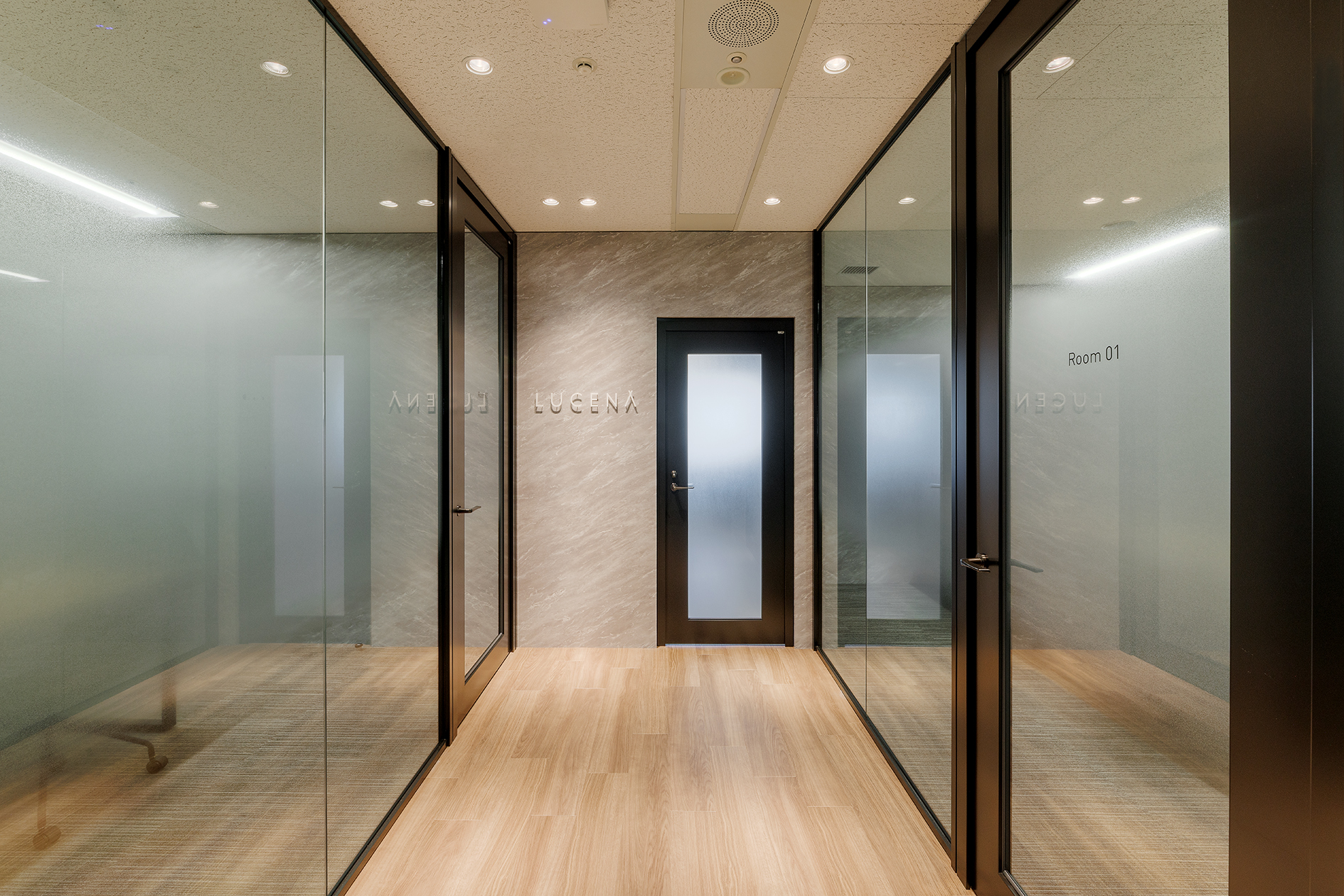 エントランスは、動きのある大理石調マテリアルを採用し、社名ロゴの影が印象的に落ちる構成とすることで、