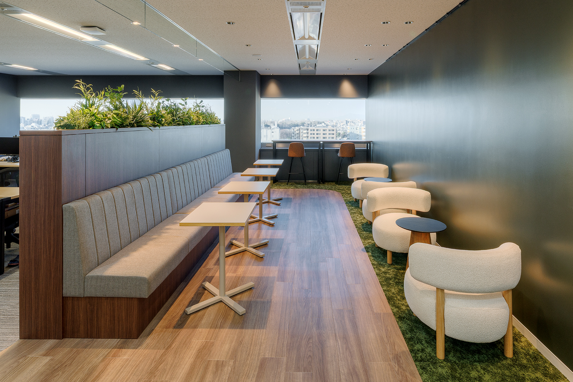 リフレッシュスペースには、ソファー席、パーソナルチェア、ハイテーブルを配置し、